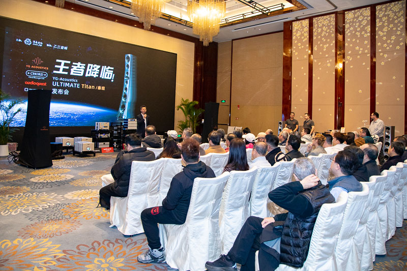 11月29日,泽森音响携手乙三音响在成都富力丽思卡尔顿酒店二楼翡翠厅举行“王者降临!YG Acoustics ULTIMATE Titan泰坦”发布会,YG Acoustics CEO Matthew Webster 先生与亚太销售总监 Aurèle Docquin 先生专程莅临,与泽森音响总经理吴佳雄先生、YG 品牌经理彭旭东先生共同完成揭幕仪式,标志着这款全球瞩目的超级旗舰正式登陆中国市场,众多行业媒体及经销商伙伴共同见证这一高光时刻。发布会现场气氛庄重而热烈,Titan 的亮相以其惊人的体量、纯机械美学与极致工程工艺,引起媒体与发烧友的强烈震撼。