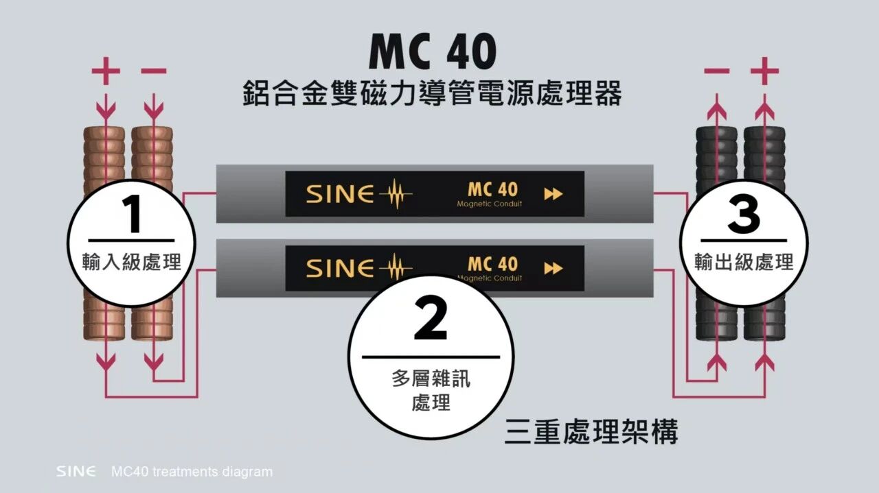 SINE全新电源处理器MC 40沿用S-60A的设计,适合影音及HiFi的中阶型号,配备升级的铝合金双磁力导管设计及超厚面板,内部线材选用13 AWG单支铜线,机身设计对发烧友摆位安置更友善