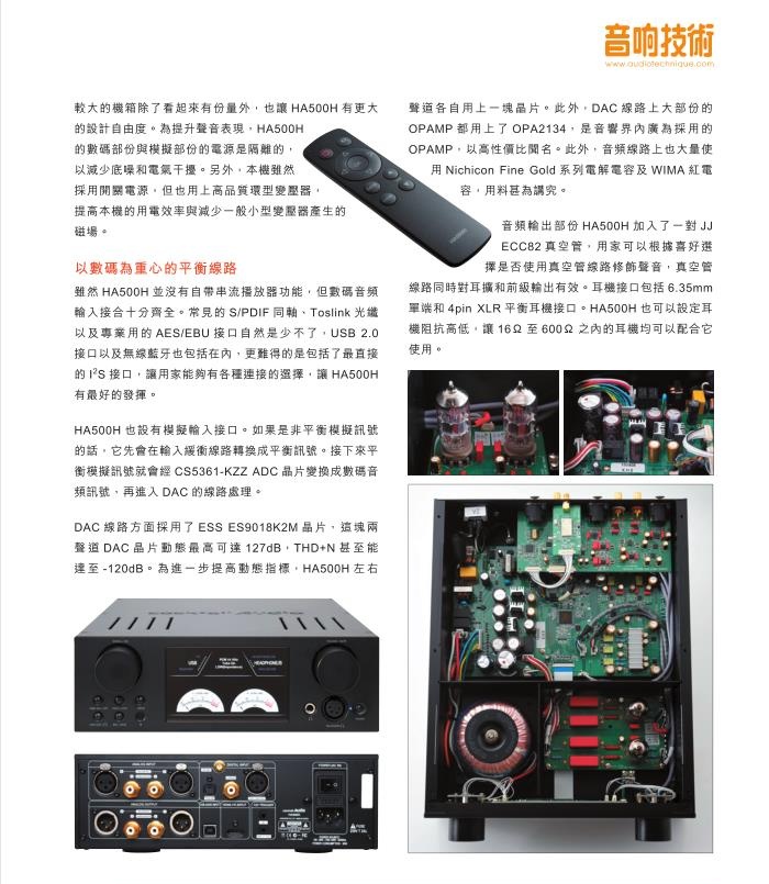 音频输出部份HA500H加入了一对JJ ECC82真空管,用家可以根据喜好选择是否使用真空管线路修饰声音,真空管线路同时对耳放和前级输出有效。耳机接口包括6.35mm单端和4pin XLR平衡耳机接口。HA500H也可以设定耳机阻抗高低,让16G至600S1之内的耳机均可以配合它使用。