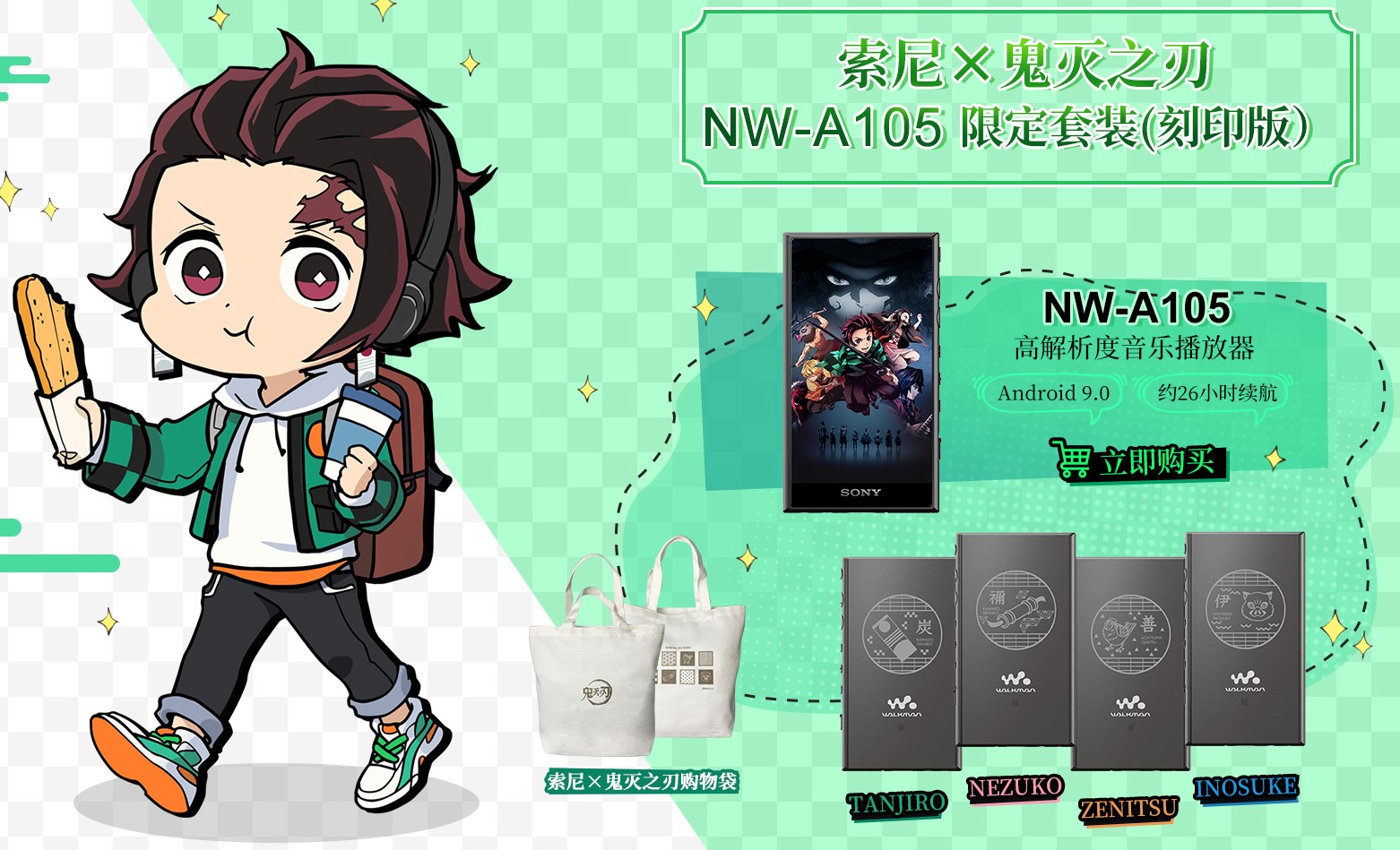 作为Walkman40周年的诚意之作,索尼NW-A105HN拥有Android 9.0的操作系统,让随身播放器向智能化更进一步。加之Hi-Res高解析度认证、S-master HX数字音频处理器以及DSEE Ultimate等软硬件功能加持,出色的音质广受用户好评。本次联动中,NW-A105机身上拥有灶门炭治郎(TANJIRO)、灶门祢豆子(NEZUKO)、我妻善逸(ZENITSU)和嘴平伊之助(INOSUKE)等人物角色的代表元素印刻。