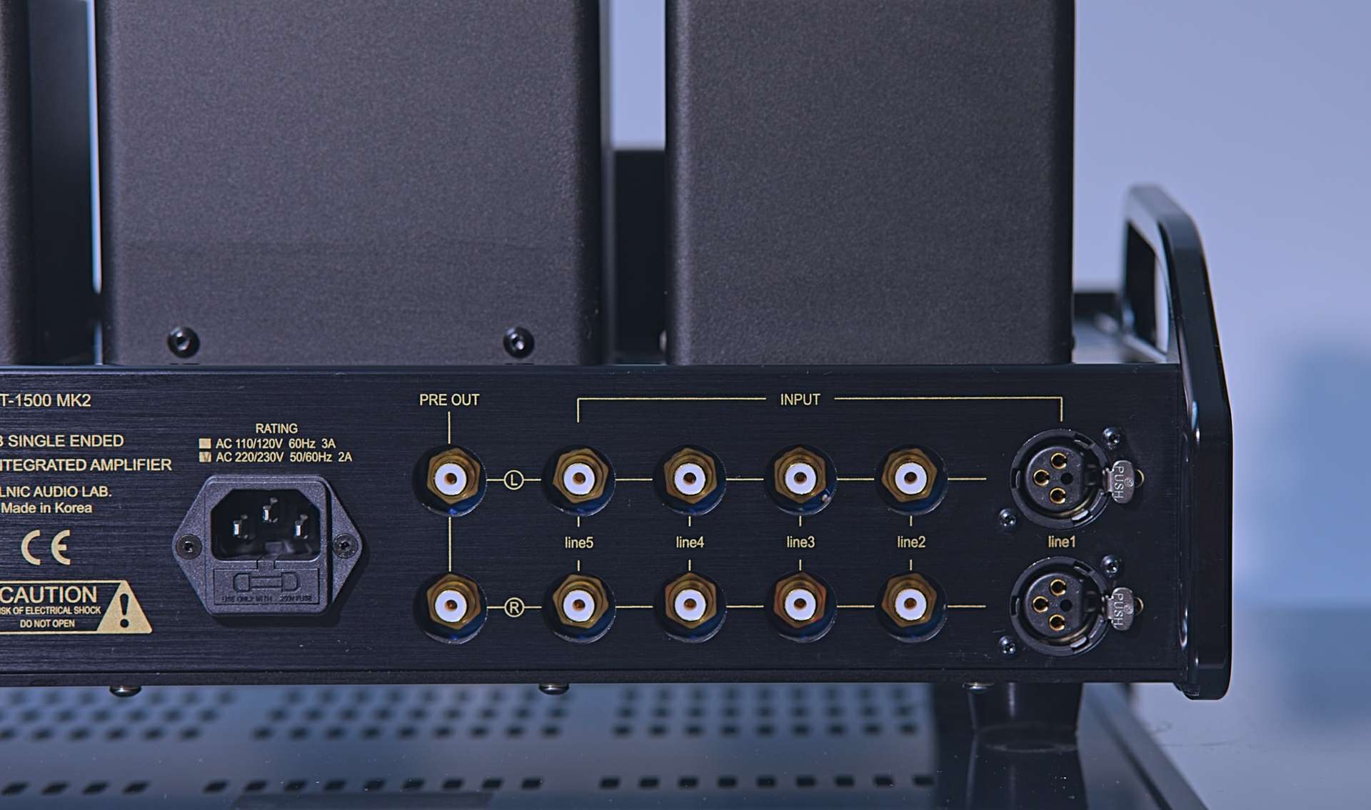 在机箱的上面,是该品牌的另一个特征元素,符合人体工程学的手柄。电源开关在功放的右侧。后面板上有一组RCA单端前级输出,四组单端RCA输入和组平衡XLR输入。这是一台单端放大器,所以平衡输入只是为了方便连接。喇叭线端子之间有一个拨杆开关,用于选择4和8Ω的输出抽头。根据用家的要求,可以订购买带有16Ω抽头的放大器。