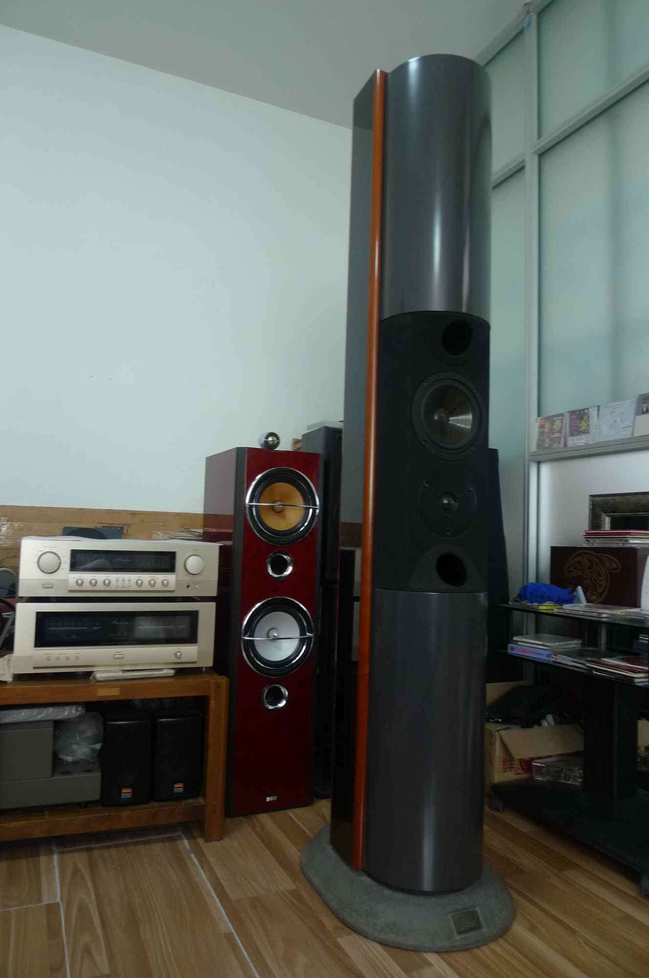 丹麦尊宝旗舰Oriel落地音箱,据尊宝公司说中国仅有6对,亚洲11对。这箱子播放交响乐气势恢弘,铺天盖地,播放小品、弦乐、人声,也是行云流水,层次分明。当年十万级别旗舰大型落地箱的表现,与丹拿信心C4,PMC的八爪鱼、B&W的D801,威信的落地等箱子不逞多让。1989年尊宝公司决定投入人力物力研发旗舰,期间搞出数款样品、请来了各路专家,终于在1991年样品定型、92年产品开始推向市场,一经面世好评如潮,92年美国芝加哥CES消费电子展荣获最佳设计及工程奖,可见实力非凡,多年以来都成为音响界的经典。让我们看看这款旗舰的几个参数:高度178公分、高音为D330、中音是著名的一屯6、5英寸、两个双8寸一屯单元为一上一下内置式设计,72KG重,灵敏度87DB,频响20??22000HZ、6欧阻抗。使用了最好的分频器,严格配对的喇叭单元都是从丹拿与一屯公司特珠定制,由该厂安装经验丰富的老技师亲手安装,但由于该款旗舰造价不菲而且,很多工序用人工打造加上高昂的售价,对普罗大众音响爱好者还是难于接受。Oriel旗舰有着无与伦比的平衡感,穆特那本已极富感情的演凑显得更加细致,不少弱音、泛音都能听得更清晰、更明显,宽阔宏大的音场、乐队强大的音流都栩栩如生地一一展现在眼前,播 “绛州大鼓”时,鼓槌敲击鼓皮发出的巨大声响在大厅中产生出丰富的谐波,现场的群情激荡欢闹热烈的场面惟妙惟肖,播贝9《欢乐颂》时,这对组合所营造的现场感、立体感,更是鲜明,主唱者与乐队之间的距离也非常明确,4位领唱歌手的歌喉张力充盈、音色瑰丽,音像逼真,确有伸手可及之感。我们再来看看这对组合在弱音小信号动态下对于这款灵敏度只有87dB的旗舰是否也有良好的表现,包括声线线条是否清晰、阴阳顿挫是否能婉转自如、各种不同乐器自身的音色是否鲜明、各类大小不同乐器的隔离度是否准确。我们播放了描绘乡间田园风光的贝多芬第6《田园》中的第2乐章。不论是双簧管的柔和清幽、圆号的丰满甜美还是长笛的欢快优雅、小提琴的浪漫情调,在这对组合身上都能淋漓尽致的发挥出来,激动时高昂、内敛时抑制,尊宝旗舰确实是一款充满创意的 即由英国箱醇厚音乐味又带有北欧箱清爽明快的经典喇叭。