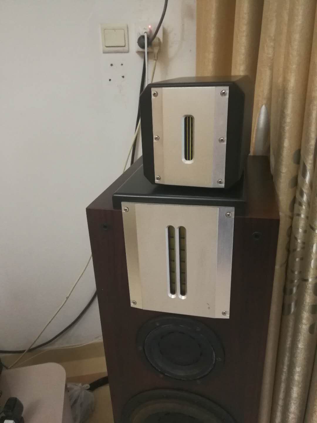 对于一个年轻人来说,没有家里的资助,不容易。机器是土炮,据说是参照CELLO磨的。分左右电源,下面转盘和CD解码。音响貌似是放珍妮西斯,用了铝带高音。总体布局,两前两后,奢侈吧?出来声音也可以。