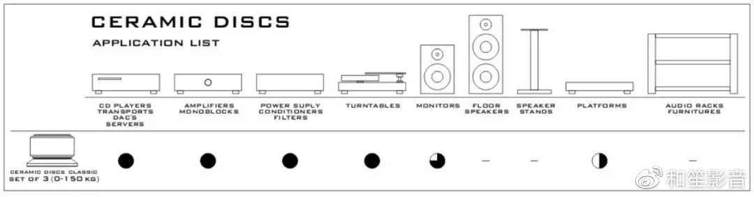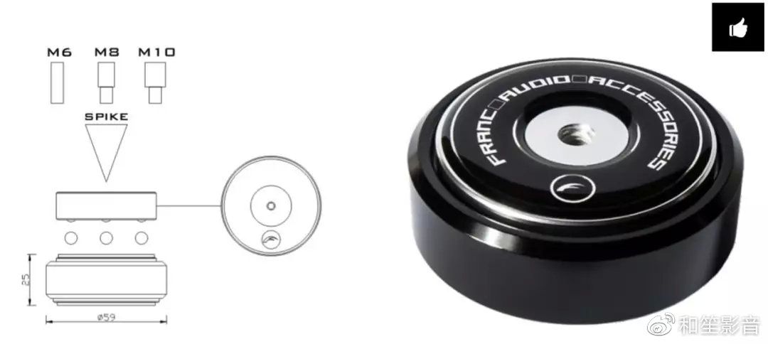 广泛的附加螺丝(M6, M8, M10)赋予陶瓷盘宽厚脚钉多种安装可能性,并且能直接安装于音频组件,机架,家具等。如果你的音频组件/机架/扬声器有自己的锥钉,你也可以安装在Fat脚钉上不卸载原来的锥钉-只需将锥钉和组件一起下降到光盘中心的中心孔中。
