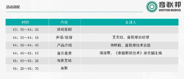 品鉴会现场,音联邦总经理王志红、音联邦技术总监肖明机以及《家庭影院技术》杂志副主编邓冠奇将为来宾进行产品系列的推荐以及音乐鉴赏活动。之后的有奖互动环节中,回答正确的参会者,将有机会获得现金券。同时,所有参会者都将获得由音联邦送出的精美伴手礼一份。