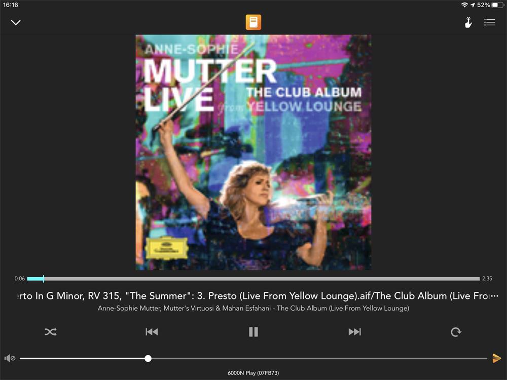 而BluOS播放音乐的画面也做得很直觉,而且看起来也蛮有质感的。主画面中会显示专辑封面,基本的播放控制与音乐来源、音乐格式都有清楚的标示。