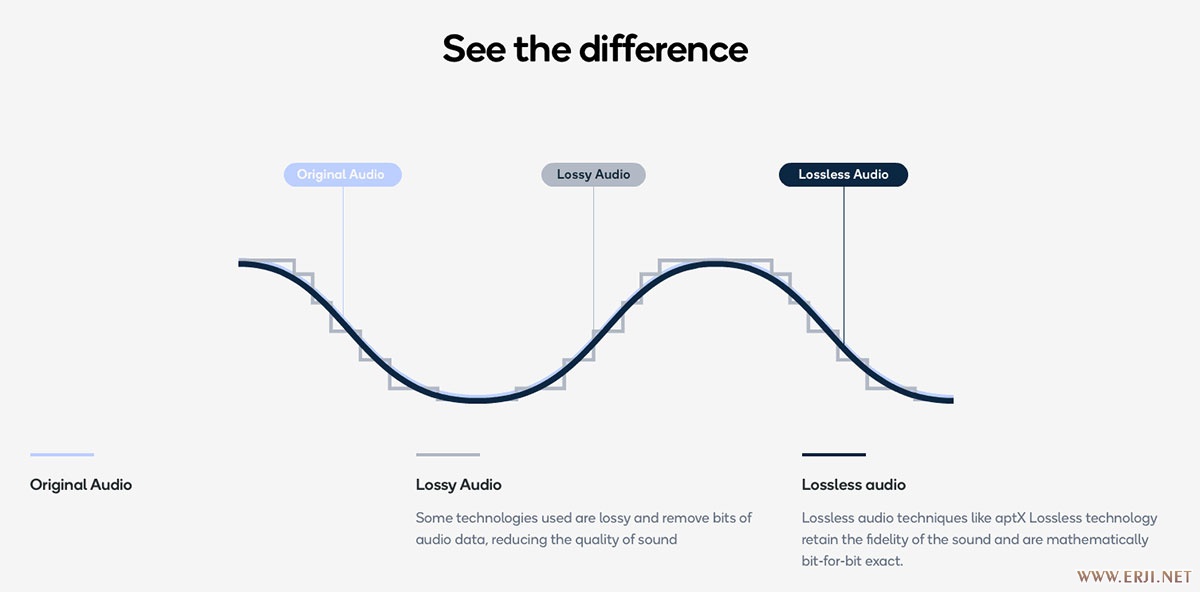 aptX Lossless 采用了无损压缩,将 1.4Mbps 频宽的 CD 音质音讯以大约 1Mbps 传输,可以还原到本来的 16bit/44.1kHz 的 bit-for-bit 音质。