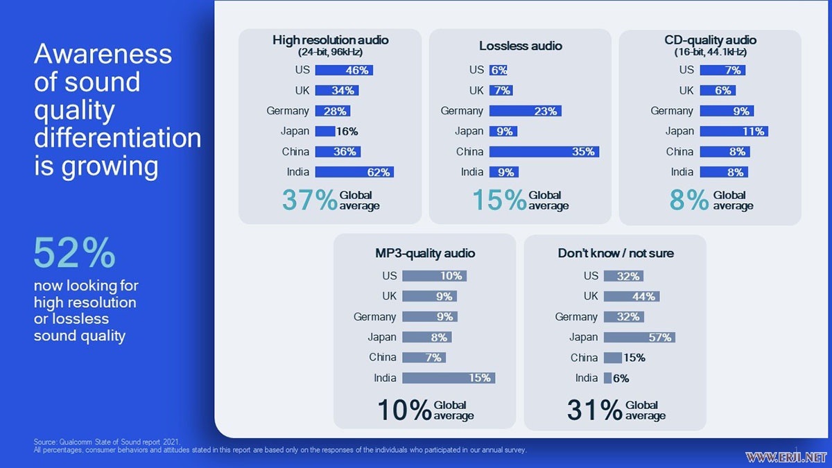 根据 Qualcomm 之前的「2021 State of Sound」调查报告,有 52% 的用家都希望蓝牙可以加入 CD 无损、甚至 Hi-Res 音质支援。