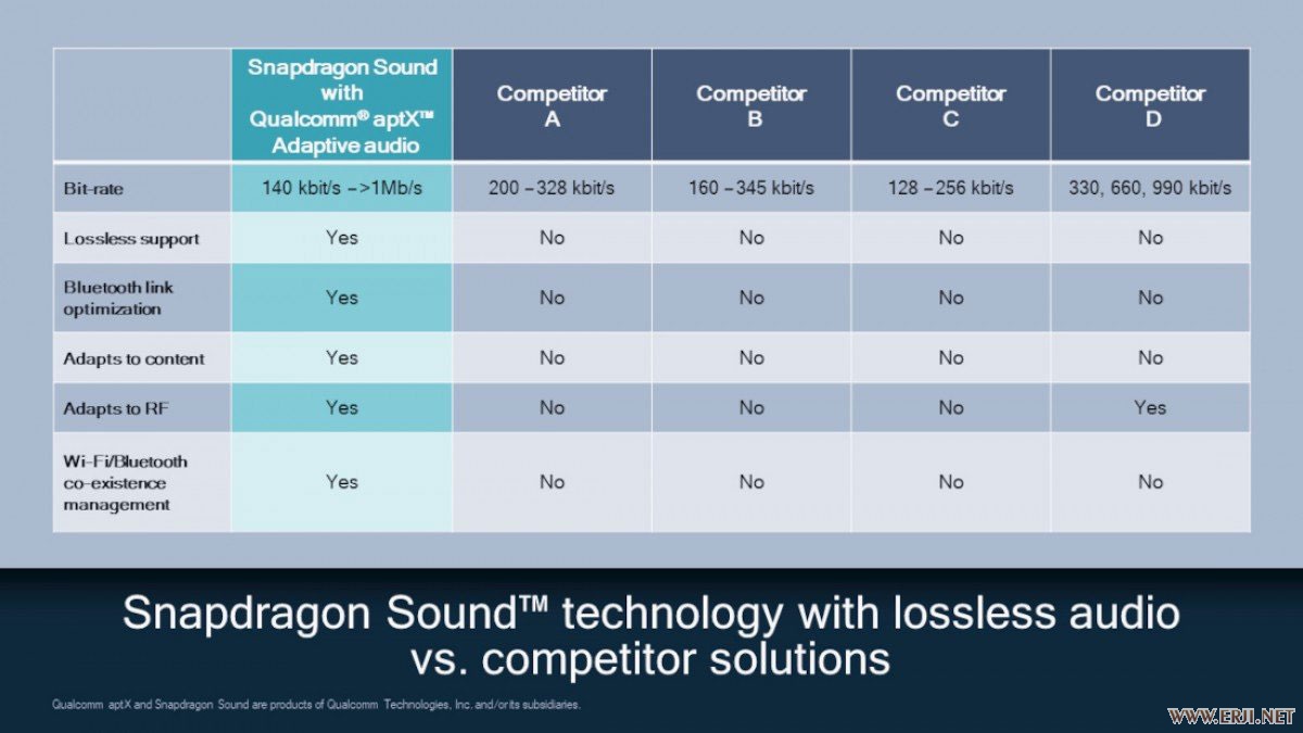 aptX Lossless 属于 Qualcomm 之前推出的 aptX Adaptive 的延伸技术,在可变频宽(140kbps - 1Mbps)的设计之下,将最高频宽提升到 1Mbps,超过了 Sony LDAC 编码的 990kbps。并且以无损压缩方式,将 CD 音质的 16bit/44.1kHz、1.4Mbps 频宽的音讯通过 aptX Lossless 来传送。