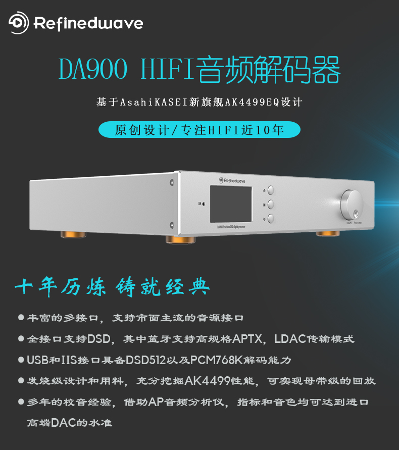 DA900开发团队通过大半年的研究测试,结合以往的大量设计经验,DA900继承了上一代产品DA800的优良水准,同时我们针对AK4499的特性,重新开发的硬件和软件构架,并不是像市面上某些产品都是套用以往产品的电路,DA900的调音方向和DA800一样,力求做到中性平衡,细腻耐听,我个人认为,整体听感上比DA800更胜一筹。