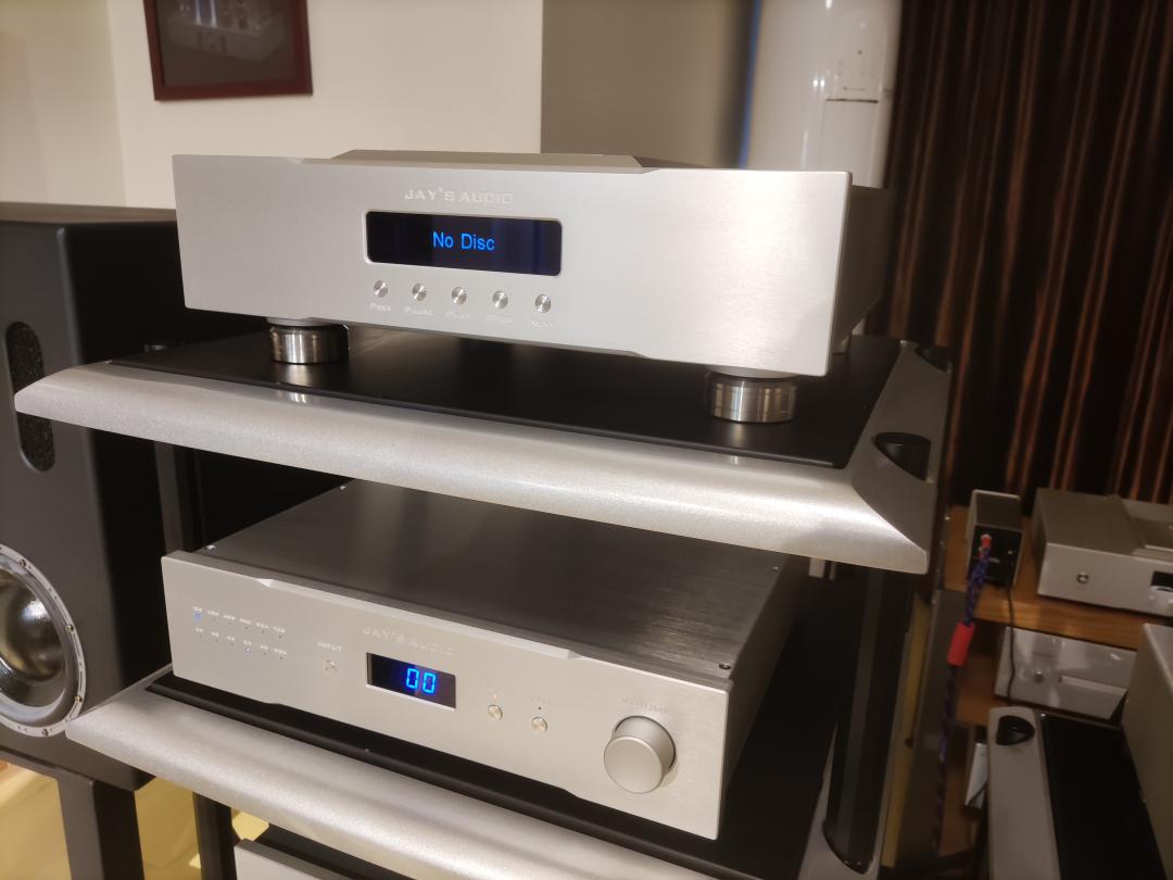 看了上面的介绍,也许你会说Jay's(捷思)音响不过是和众多音响一样,采用了很多高级元器件的国货产品罢了,其实不然,尽管Jay's(捷思)音响在元器件上的确采用了很多进口高端元器件,但即便是把它们组装在一起,最后的好声还是来自设计者对它的调试。应该说这套组合,相信设计者也是经过了多次配搭,多次调试后才出来的如此好声。既有声音的温润绵密之感,也有声音的细腻厚实,乐感更是相当的突出,背景也是非常干净。既然这套组合采用了I2S(差分信号),那么我在转盘与解码器之间就采用了HDMI线来做连接,应该说透过这样的连接方式,相比同轴线表现似乎更为优秀,如果说采用数字同轴线,我们感受到一种略显轻盈柔美的音色,那么用上HDMI线,以I2S的方式连接,不仅可以让我们感受到较好的清晰度,更能让我们充分享受到一个良好的声场和三维感,特别是当我选择美国PAD线材的Diamond Revision HDMI线后,整体的空间感更是提升不少,前后的纵深与宽阔都有上佳表现。配搭来自英国的美丽安Z350功放和美之声Encore 50落地音箱,播放龙源唱片最新出品的《马足龙沙》,第一首《马足龙沙》,就让我们充分感受到了一股强烈的气势和声音的准确性,那份真实与自然,在整个空间得到最好的回放。播放三毛的《回声》,人声的真实与清晰,那份轻松与齿音的纯正也是得到太多人的认可。如果说搭配美丽安的Z350更多得是真实,那么配搭麒麟的KR8+P250前后级,不仅有真实的一面,更有那么一点韵味和强大的力量感,同样是《马足龙沙》,美丽安带给我们的是真实与清晰,但力量感略显薄了点,也许与它的2*130W的功率有关,麒麟的P250为2*250W的立体声后级,力量感爆棚,气势更加恢弘,人声也颇有色彩。可以说Jay's(捷思)音响作为国内的专业信号源研发者,它给我们的不仅仅是真实,还有精准。它让我们感受到了什么是清晰,什么是严谨,也让我们知道了靡靡之音对于真正喜欢音乐的人来说并不好。所以今天我在这里诚恳地向各位推荐这套来自中国的-Jay's(捷思)CDT2-MK3转盘和DAC2-MK3 R2R解码器。