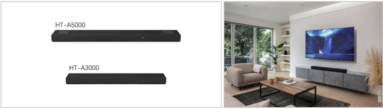 (左)索尼高端回音壁HT-A5000和HT-A3000;(右)HT-A5000在客厅中的实景图